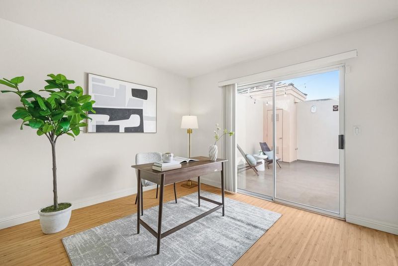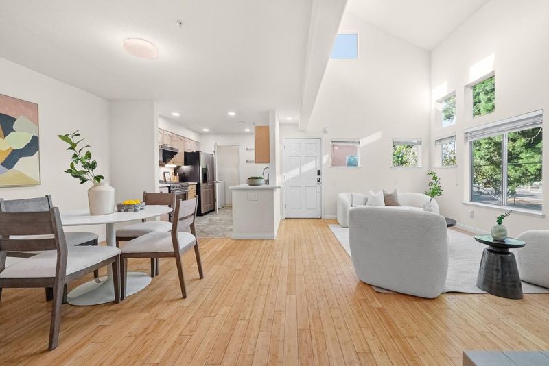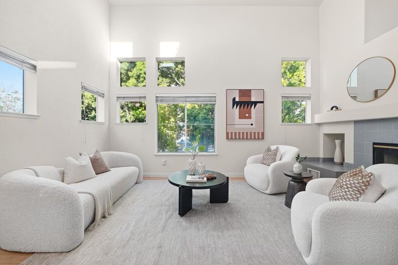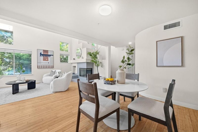 Beautiful two-story Expressions townhouse-style home featuring 2 spacious primary suites, 2.5 baths, a den, and approximately 1,584 sq ft of living space, plus a large private balcony. Dramatic high ceilings create an open and airy atmosphere, while the living room offers a cozy fireplace for added warmth and charm. The kitchen is equipped with stainless steel appliances, including a gas range, and the home also features interior laundry, central heating and air conditioning, premium bamboo flooring, new bedroom flooring, and updated stairs. Enjoy the convenience of an oversized side-by-side 2-car garage.Ideally located in the heart of Silicon Valley, the community offers resort-style amenities including a pool, spa, clubhouse, playground, and BBQ area, with HOA covering water. Excellent location close to schools, parks, shopping, major tech companies, downtown Sunnyvale, Highways 237, 85, 101, and Caltrain.
