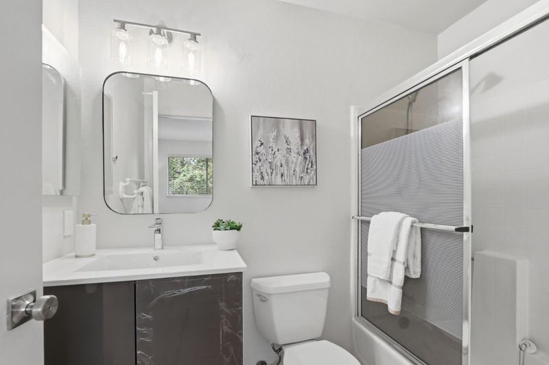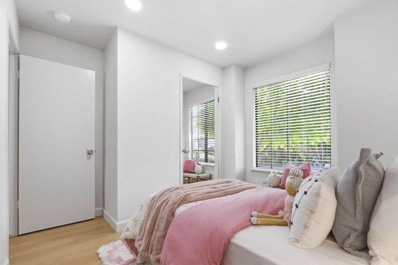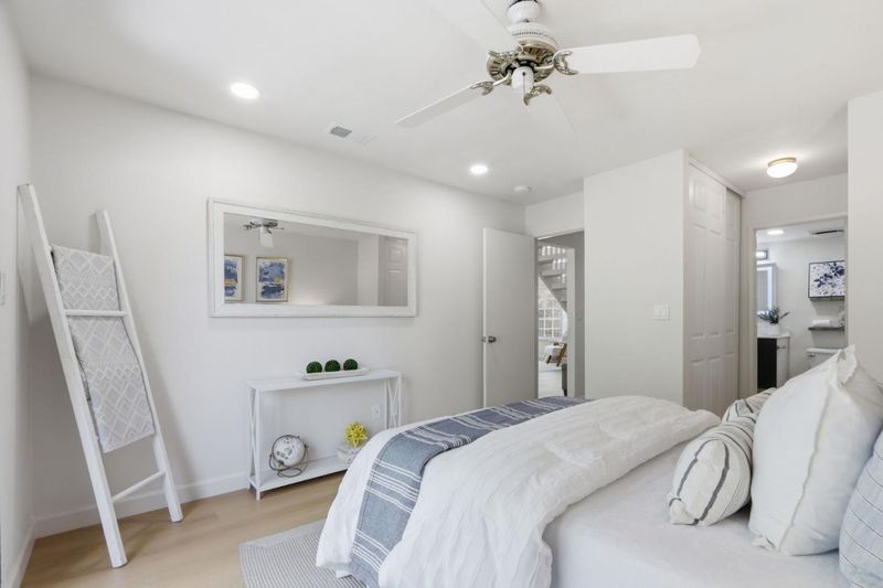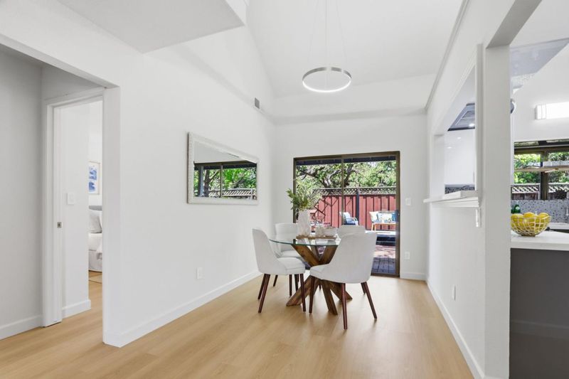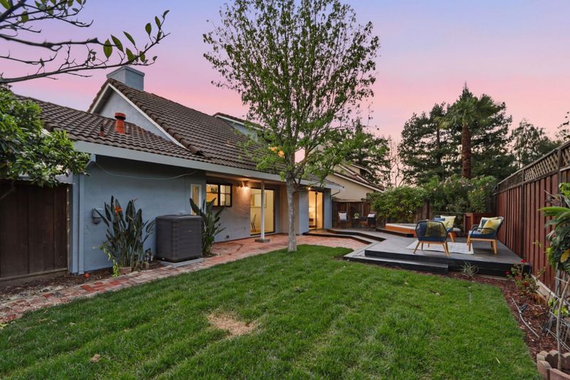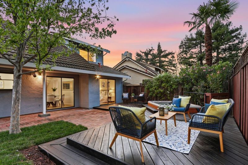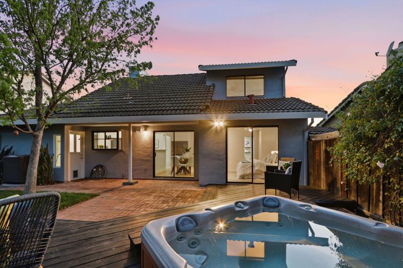 Beautifully updated home with two ground floor bedrooms offering a stylish living space on one of the larger parcels in the neighborhood. Stunning Japanese maple, roses, and lush greenery. New luxury vinyl plank flooring throughout, soaring ceilings, abundant natural light, and a warm, inviting living room anchored by a charming wood-burning fireplace and a picturesque bay window. The chefs kitchen shines with quartz slab countertops, mosaic tile backsplash, striking two-tone cabinetry, stainless steel appliances, and a garden window overlooking the yard. The flexible floor plan includes two ground-level bedrooms with recessed lighting and backyard access, plus an upstairs primary retreat with walk-in closet and updated en suite bath. Additional amenities include solar, central A/C, attached 1-car garage with built-in cabinetry, laundry area, The private backyard backs to wooded views and is designed for relaxation and entertaining with a covered brick patio, wood deck, hot tub, mature landscaping, fruit trees. Ideally located near parks, trails, and top-rated schools. Walkable to Alamitos Creek trail and Mockingbird entrance to Quicksilver Park. Graystone, Bret Harte Middle, Leland High.
