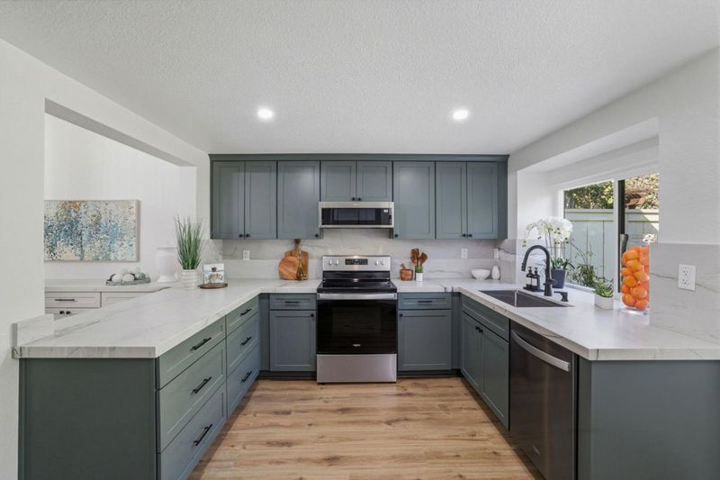 - 220 Volt Outlet, Countertop - Quartz, Dishwasher, Garbage Disposal, Ice Maker, Microwave, Oven Range - Electric, Pantry, Refrigerator