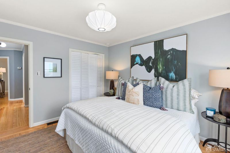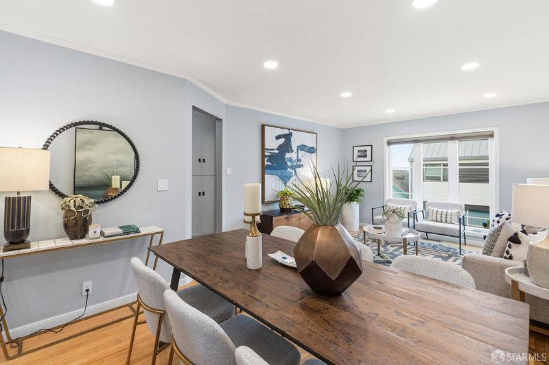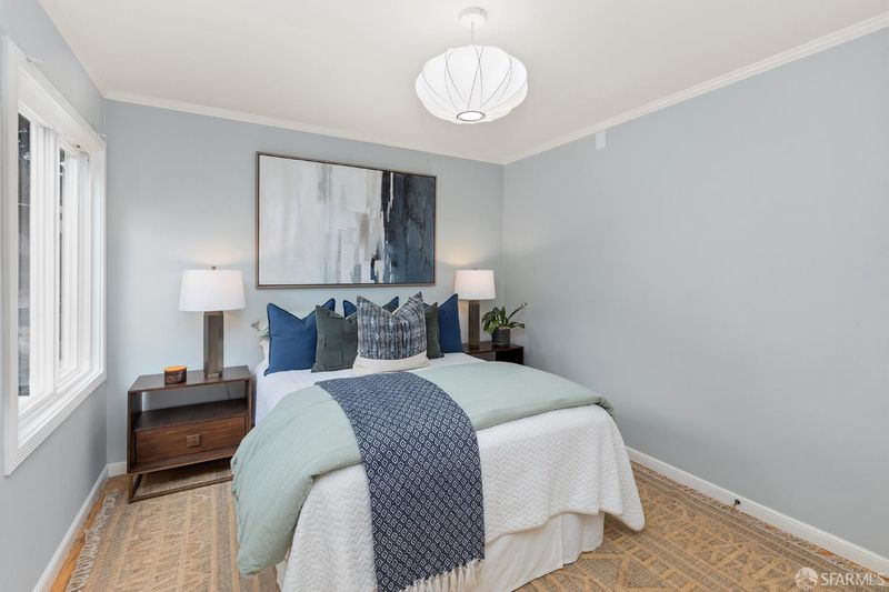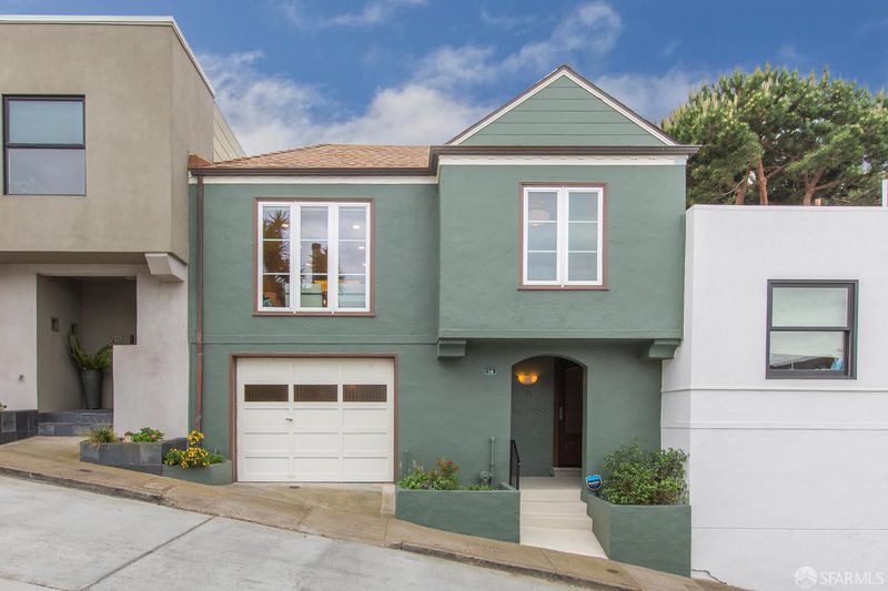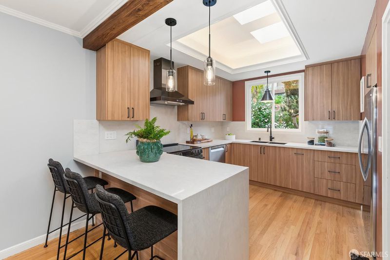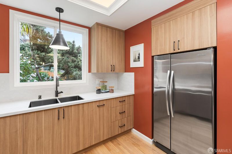 Tucked away on a quiet Bernal Heights cul-de-sac street, this thoughtfully upgraded home blends classic charm with modern improvements and partial Golden Gate Bridge views. Featuring 2 bedrooms, 1 bath, a flexible office space, and a large garage with laundry and storage, the home offers comfortable living with a strong focus on quality upgrades throughout. The remodeled kitchen is enhanced by new skylights with remote-controlled shades, a new induction range, a Bosch dishwasher, and updated finishes, all set over new hardwood flooring. The bathroom has been tastefully renovated and includes a new skylight with remote operation. A walnut beam adds warmth and character to the breakfast bar, complementing the home's mid-century appeal. The outdoor space offers a private flowering garden retreat, while a gate to Coso Street provides easy access to Bernal Hill's scenic trails and panoramic views. Ideally located near Mission Street and Cortland Avenue's shops, cafs, organic market, and neighborhood favorites, this home captures the best of Bernal Heights living.