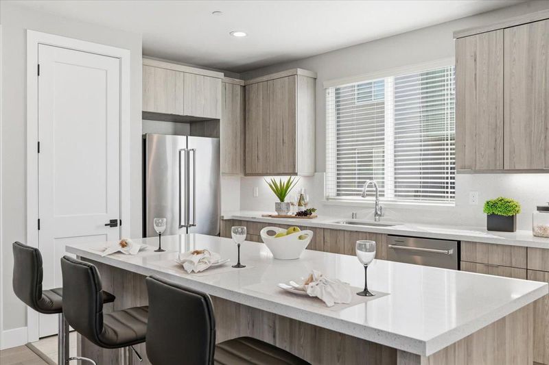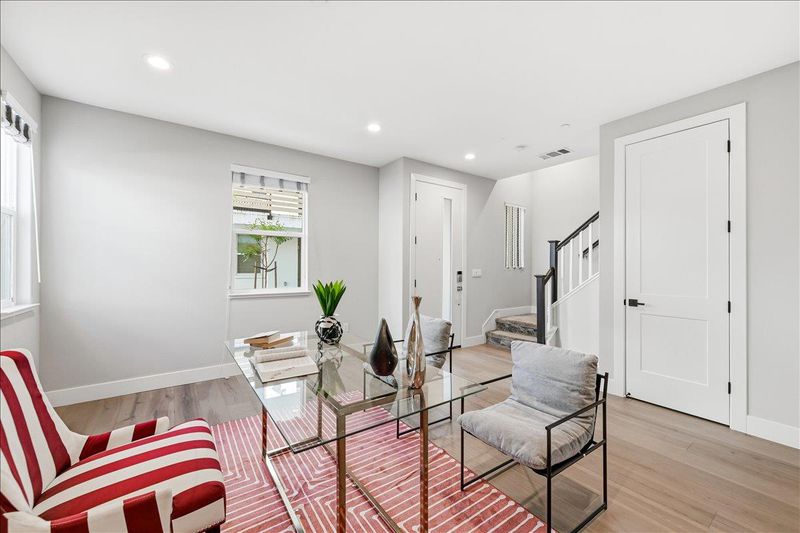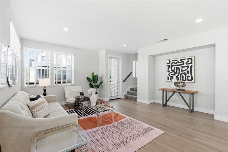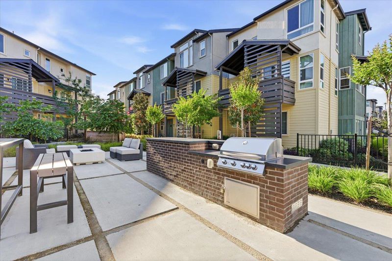 Bright and spacious corner townhome featuring abundant windows and natural light throughout. The ground level offers a versatile den/office, ideal for a home workspace or additional living area. The main level showcases an open-concept layout where the living and dining areas flow seamlessly into a separate family room with direct access to a private outdoor patioperfect for everyday living and entertaining. The gourmet kitchen boasts a large quartz island and countertops, stainless steel appliances, and ample cabinetry for storage. Upstairs, youll find three well-appointed bedrooms, including a private primary suite with a walk-in closet and dual-sink vanity bath. Additional highlights include a side-by-side attached garage with a EV charging outlet, a solar energy system for enhanced efficiency and reduced utility costs, and a location within a desirable school district. Conveniently situated near major tech campuses, South Bay and East Bay commute routes, and just minutes from shopping and dining at Great Mall.