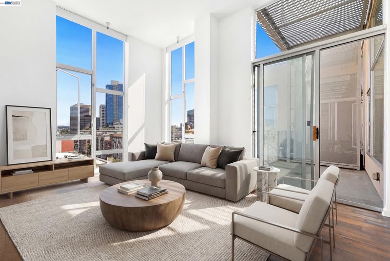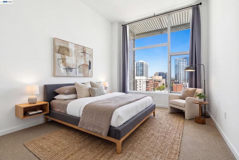 Fantastic Penthouse location, facing sunrise with a view of the Oakland Skyline! Large one bedroom condominium, with unique floor plan allowing privacy for the bedroom area. Super tall ceilings about 11 ft with floor to ceiling windows and access to a large balcony. Washer and Dryer in-unit, parking with storage, building offers a fitness room, courtyard with BBQ and community and package room and dog run! HOA covers more than the basics- water, gas, sewer, trash and high-speed internet along with all the amenities. Pictures are virtually staged