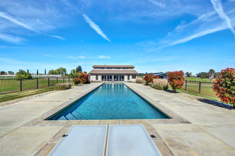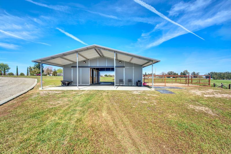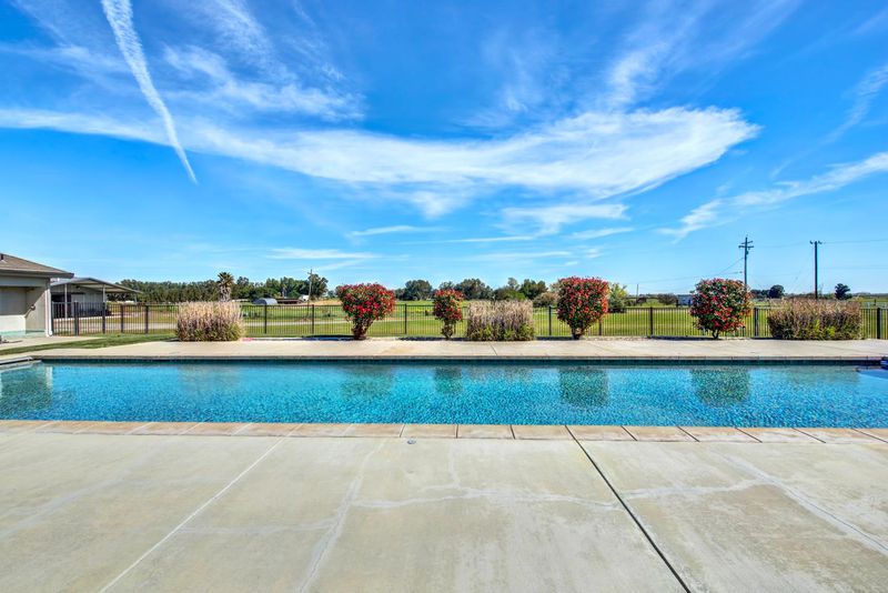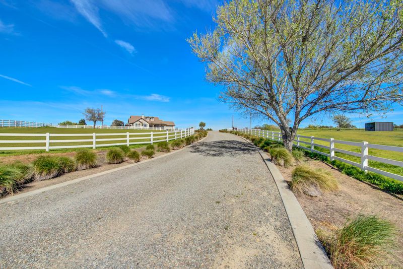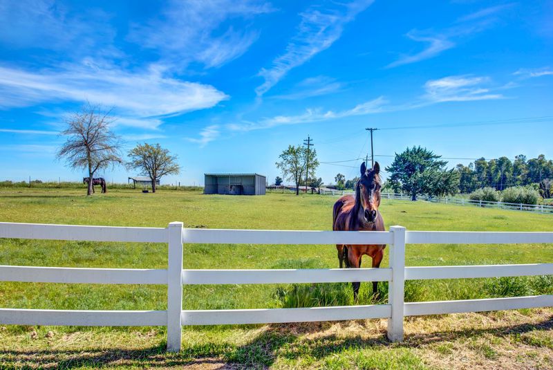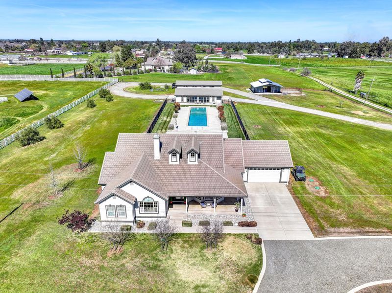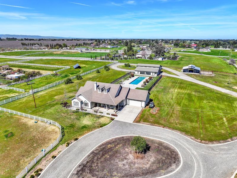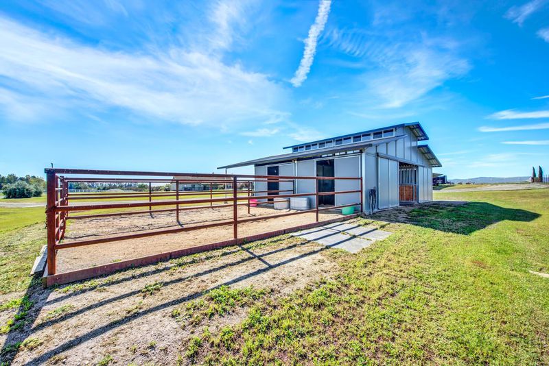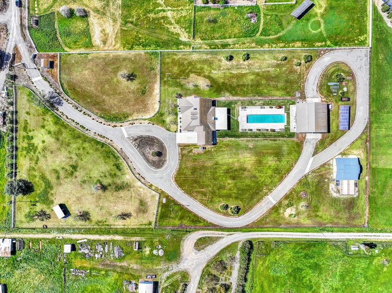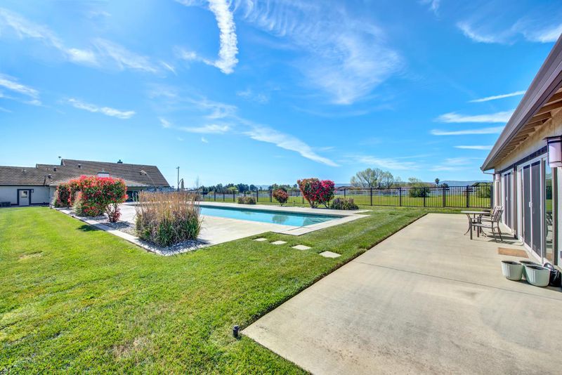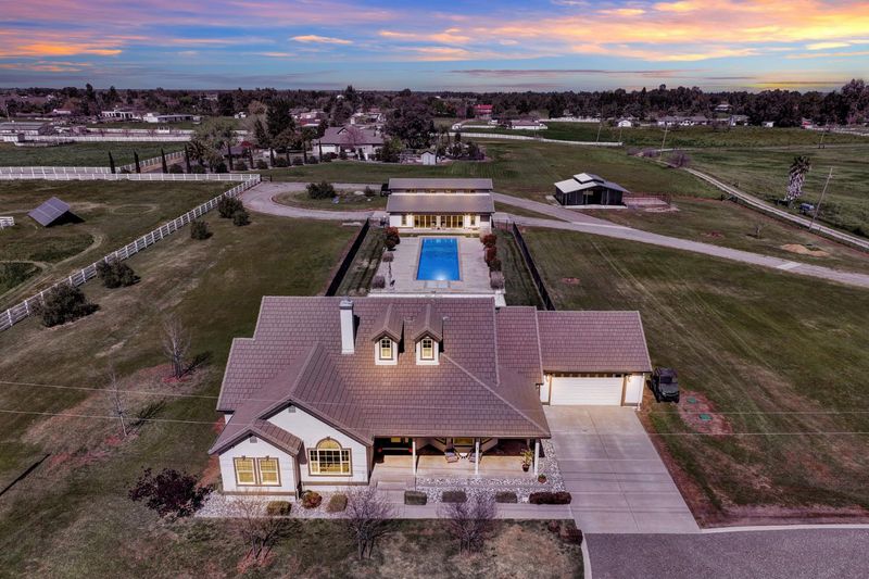 Perched atop a gentle knoll, this exceptional custom home offers breathtaking sunset views and a serene sense of privacy. A sweeping gated entrance and classic white fencing welcome you to your own private retreat. Designed with both comfort and elegance in mind, the open-concept floor plan features a sun-filled great room that flows seamlessly into the gourmet kitchen, complete with granite countertops, an expansive pantry, and generous bar seating. The adjoining formal dining area provides the perfect setting for refined entertaining. A standout feature of the home is the spacious entertainment room, equipped with a secondary full kitchenideal for hosting large gatherings with ease. The luxurious primary suite offers a spa-inspired bath with separate tub and shower, a walk-in closet, and an adjacent office filled with abundant natural light. Step outside to enjoy a beautifully designed outdoor living space, featuring a large patio with a newly constructed cover, overlooking a sparkling pool and spa. The impressive pool house includes a kitchen and bath, offering excellent potential as an ADUperfect for multi-generational living, guests, or rental opportunities. Additional amenities include an oversized two-car garage, owned solar for energy efficiency, and a comprehensive water conditioning system. The property is thoughtfully equipped with a 2-inch irrigation system encircling the perimeter for ease of maintenance. Equestrian enthusiasts will appreciate the four-stall horse barn with reinforced steel pipe fencing. Completing the property is an extraordinary 50x50 fully finished, insulated, and painted shop, featuring two large roll-up doors for RV drive-through access, two additional roll-up doors, and finished concrete flooring. Meticulously maintained and thoughtfully designed, this one-of-a-kind property offers the perfect blend of luxury, functionality, and country charm.