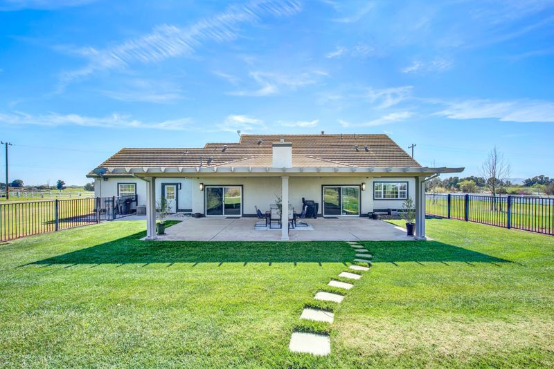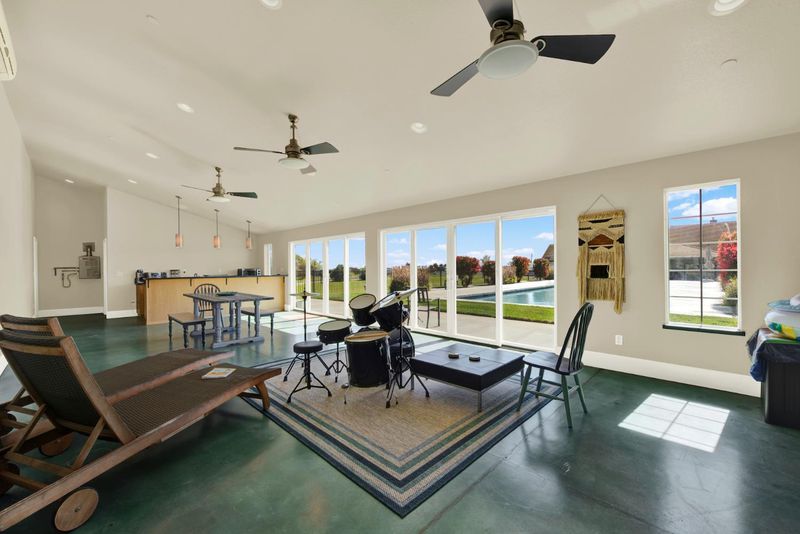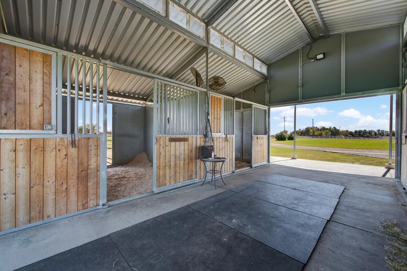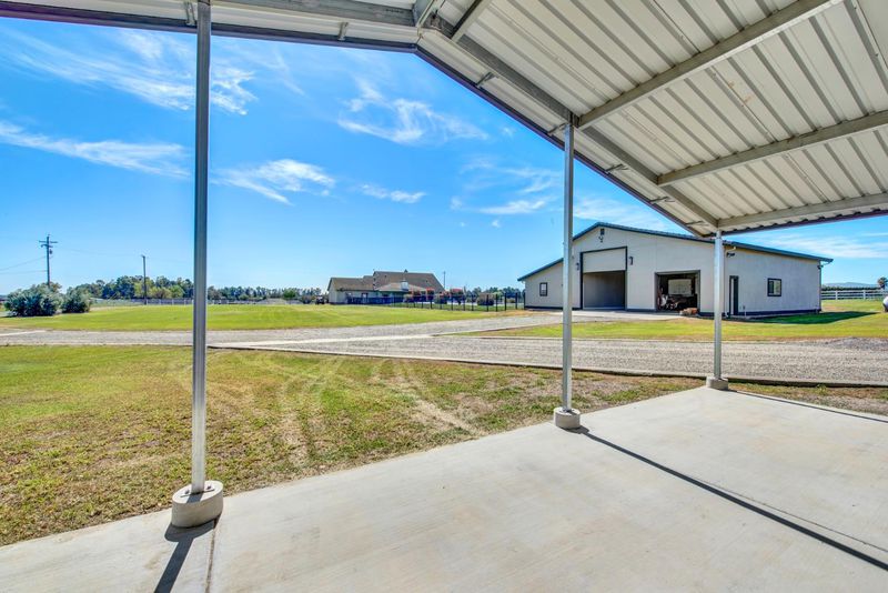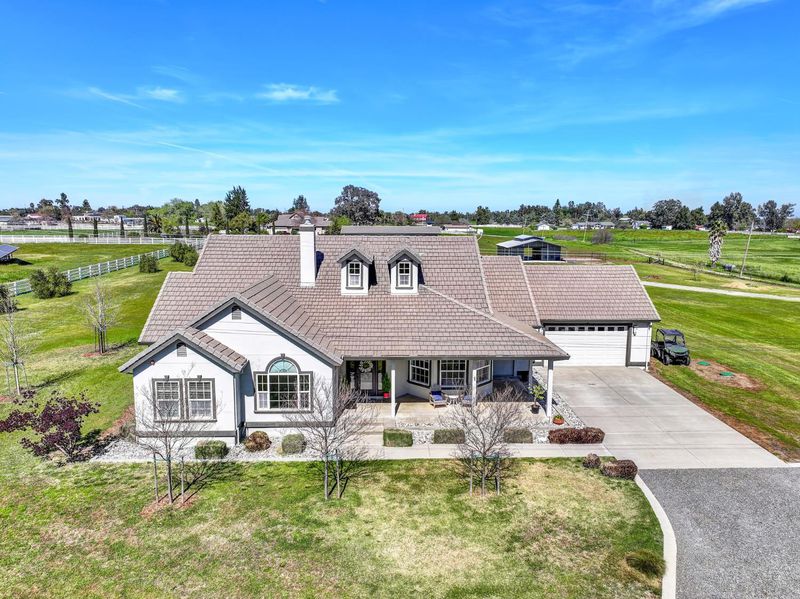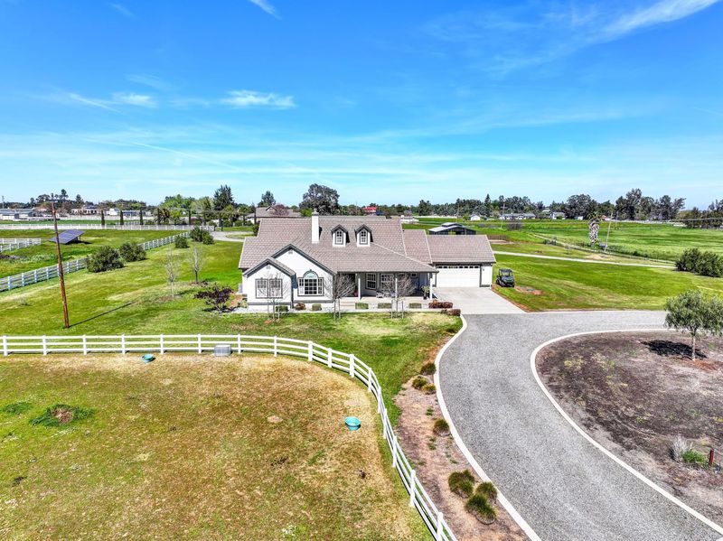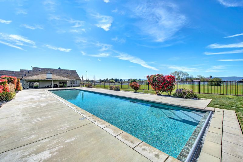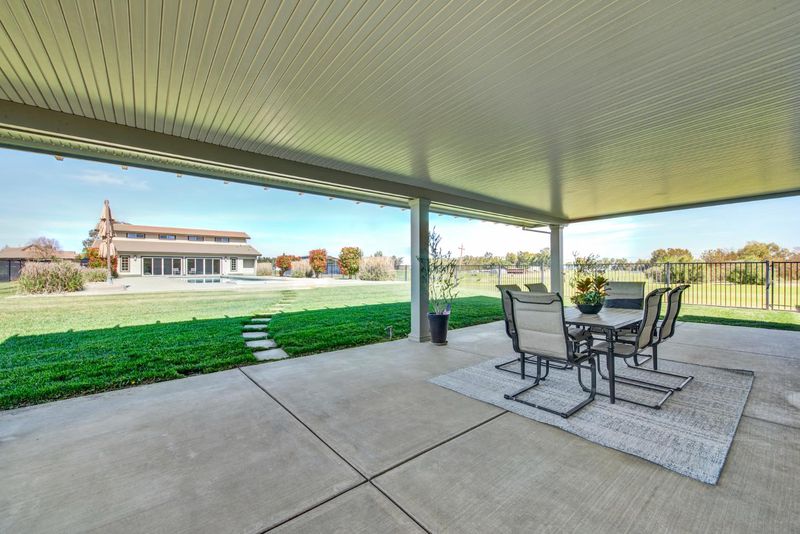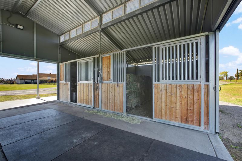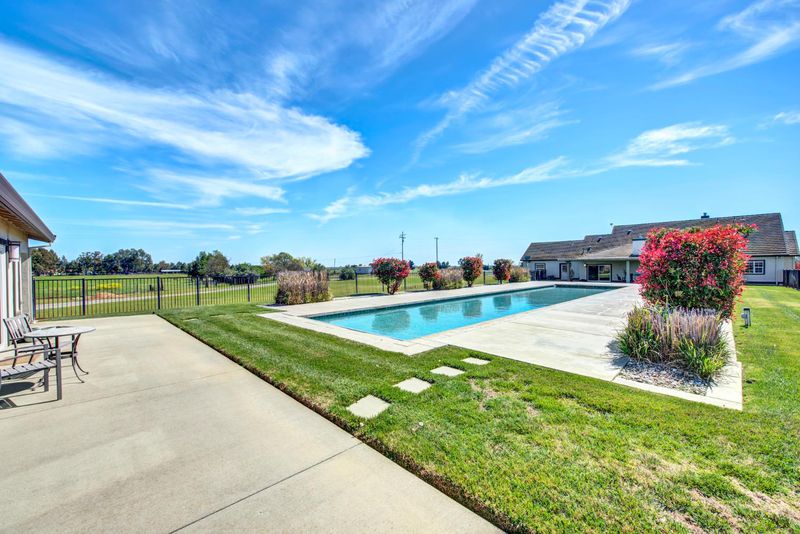 Perched atop a gentle knoll, this exceptional custom home offers breathtaking sunset views and a serene sense of privacy. A sweeping gated entrance and classic white fencing welcome you to your own private retreat. Designed with both comfort and elegance in mind, the open-concept floor plan features a sun-filled great room that flows seamlessly into the gourmet kitchen, complete with granite countertops, an expansive pantry, and generous bar seating. The adjoining formal dining area provides the perfect setting for refined entertaining. A standout feature of the home is the spacious entertainment room, equipped with a secondary full kitchenideal for hosting large gatherings with ease. The luxurious primary suite offers a spa-inspired bath with separate tub and shower, a walk-in closet, and an adjacent office filled with abundant natural light. Step outside to enjoy a beautifully designed outdoor living space, featuring a large patio with a newly constructed cover, overlooking a sparkling pool and spa. The impressive pool house includes a kitchen and bath, offering excellent potential as an ADUperfect for multi-generational living, guests, or rental opportunities. Additional amenities include an oversized two-car garage, owned solar for energy efficiency, and a comprehensive water conditioning system. The property is thoughtfully equipped with a 2-inch irrigation system encircling the perimeter for ease of maintenance. Equestrian enthusiasts will appreciate the four-stall horse barn with reinforced steel pipe fencing. Completing the property is an extraordinary 50x50 fully finished, insulated, and painted shop, featuring two large roll-up doors for RV drive-through access, two additional roll-up doors, and finished concrete flooring. Meticulously maintained and thoughtfully designed, this one-of-a-kind property offers the perfect blend of luxury, functionality, and country charm.